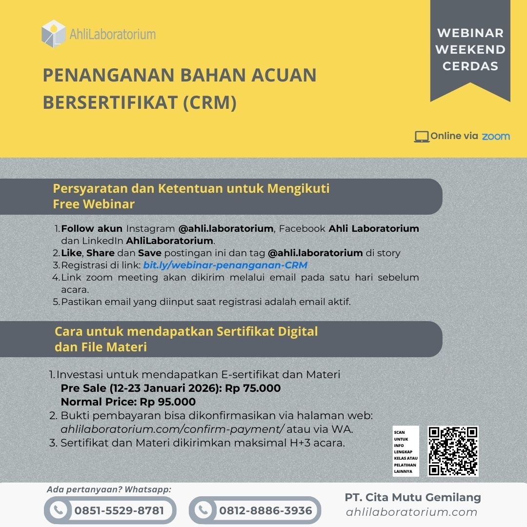 Melalui webinar dan pelatihan ini, peserta akan mempelajari cara menangani CRM secara tepat, mulai dari tahap pemilihan, penerimaan, penyimpanan, penggunaan, hingga pencatatan sesuai ketentuan sertifikat. Dengan pemahaman yang terarah dan aplikatif, personel laboratorium dapat meminimalkan risiko kesalahan pengujian, menjaga integritas data, serta meningkatkan kesiapan laboratorium dalam menghadapi audit dan evaluasi mutu.